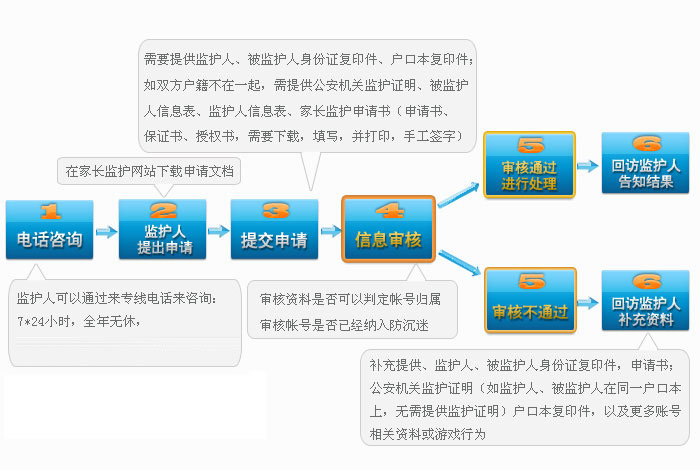 1、监护人信息表(包含监护人的身份证明复印件);2、被监护人信息表(包含被监护人所玩游戏相关信息及身份证明复印件);